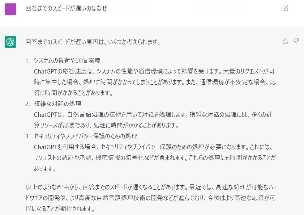 「(ChatGPTが)回答までのスピードが遅いのはなぜ?」とChatGPTに聞いてみると、