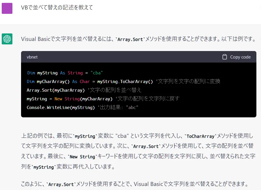 上記の例では、最初にmyString変数に “cba” という文字列を代入し、ToCharArrayメソッドを使用して文字列を文字の配列に変換しています。次に、Array.Sortメソッドを使用して、文字の配列を並べ替えています。最後に、New Stringキーワードを使用して文字の配列を文字列に戻し、並べ替えられた文字列をmyString変数に再代入しています。
