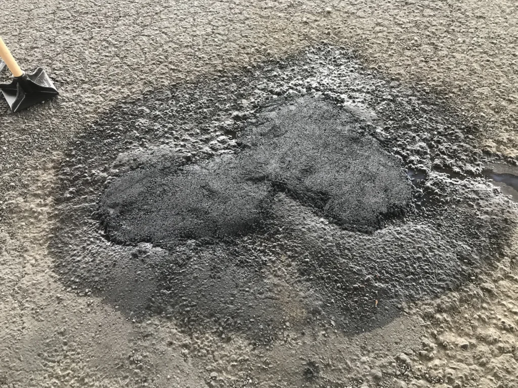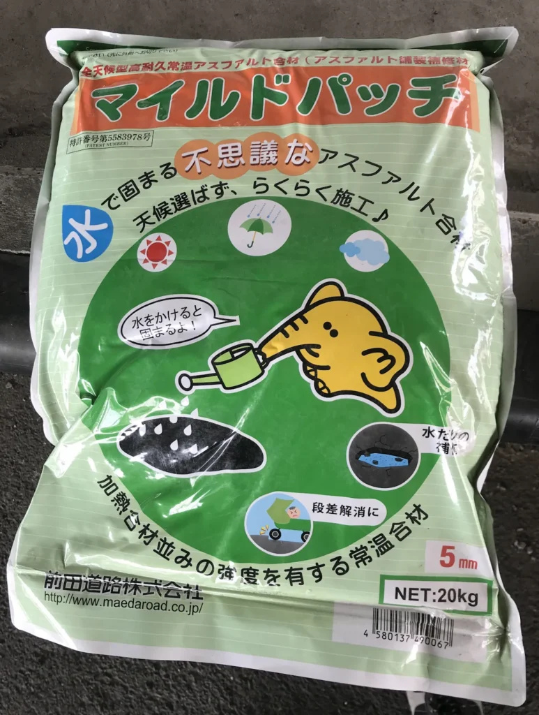 このアスファルト合剤、とにかく叩いて固めた方が良いらしいです。そうすることでより固く硬化することを、以前知人に教わりました。