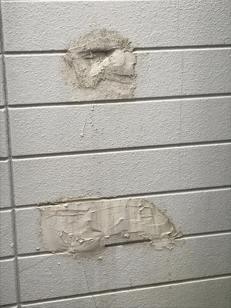 さて別の補修です。これは10年ほど前に行ったものですが、倉庫の壁にフォークリフトで誤って穴をあけられてしまい、直したものです。見栄えはよくありませんが、雨水の侵入は防げています。その際に用いた材料は、ALC補修材です。