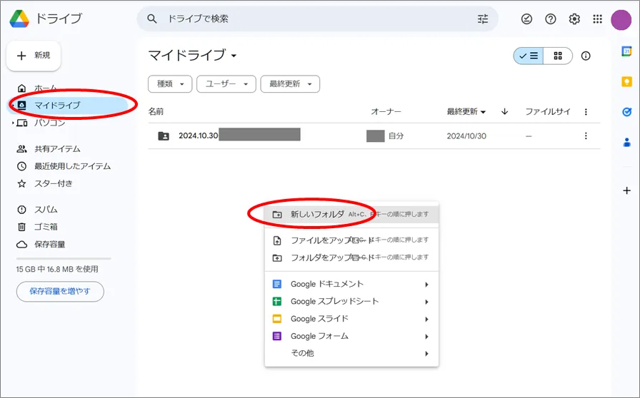 ※このフォルダは作らなくても機能的には問題ありませんが、作っておいた方が、後々マイドライブ内の整理がしやすいのでオススメしています。(「マイドライブ」をクリックしてから右クリックすると「新しいフォルダー」の作成が可能になります。)