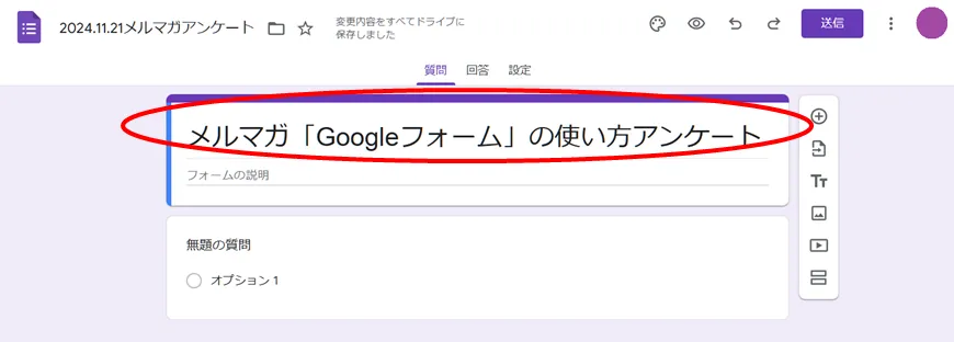 今回は、「メルマガ「Googleフォームの使い方アンケート」」としました。