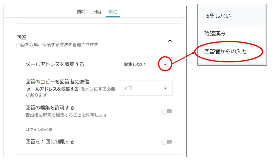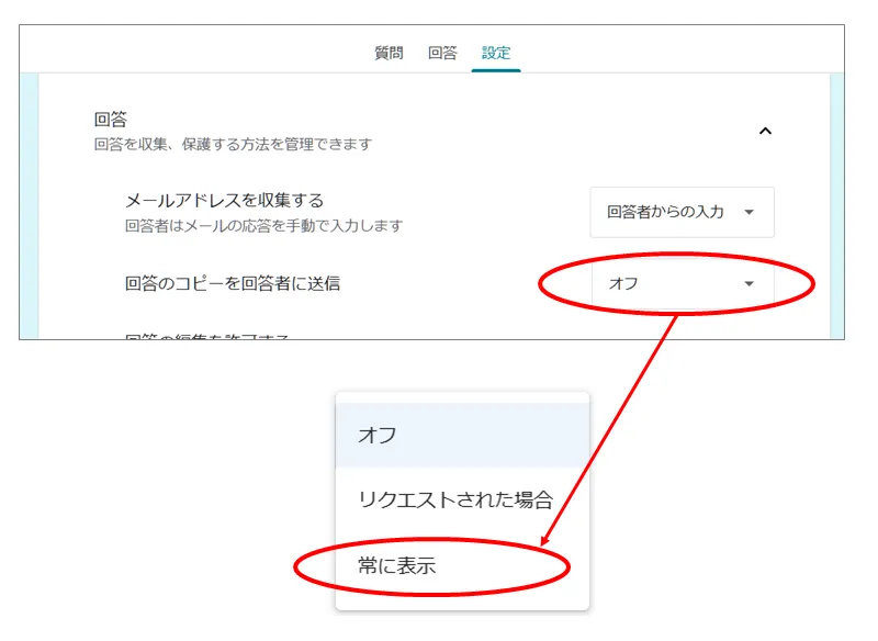 「設定」タグの、「回答のコピーを回答者に送信」を「常に表示」とすることで、自動返信されるようになります。