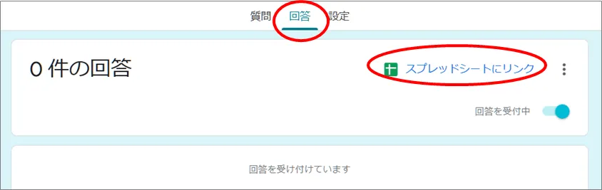 「回答」タグの、「スプレッドシートにリンク」をクリックするだけで完了です。
