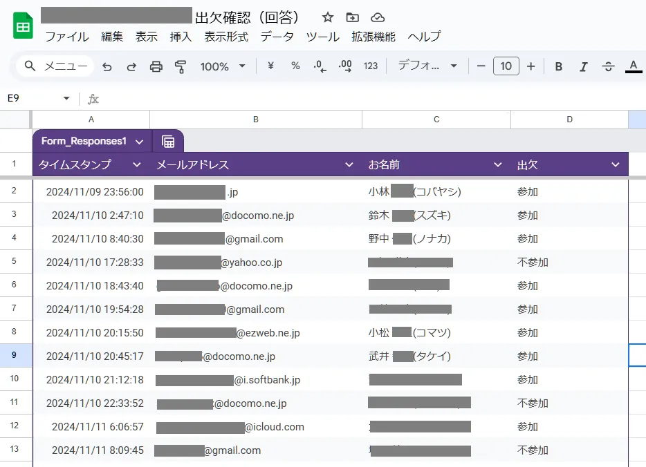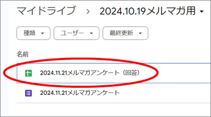 このように同一フォルダ内にスプレッドシートができて、新たな回答は自動的に記録されます。