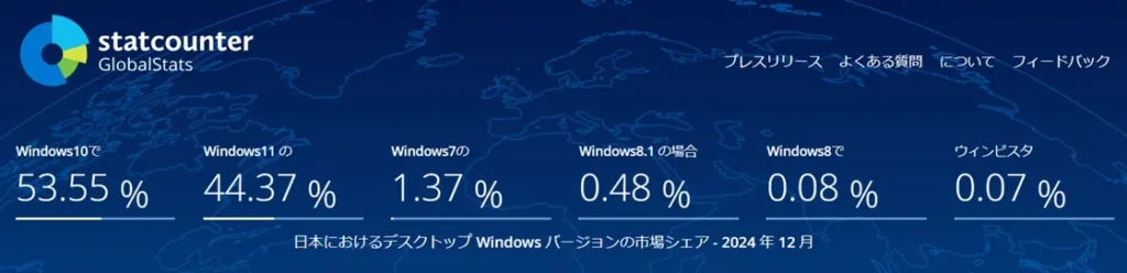 以下のデータは、StatCounter(スタットカウンター)というサイトからの抜粋で、日本国内2024年12月時点のWindowsについて、53.55%がWin10、44.37%がWin11ということが示されています。