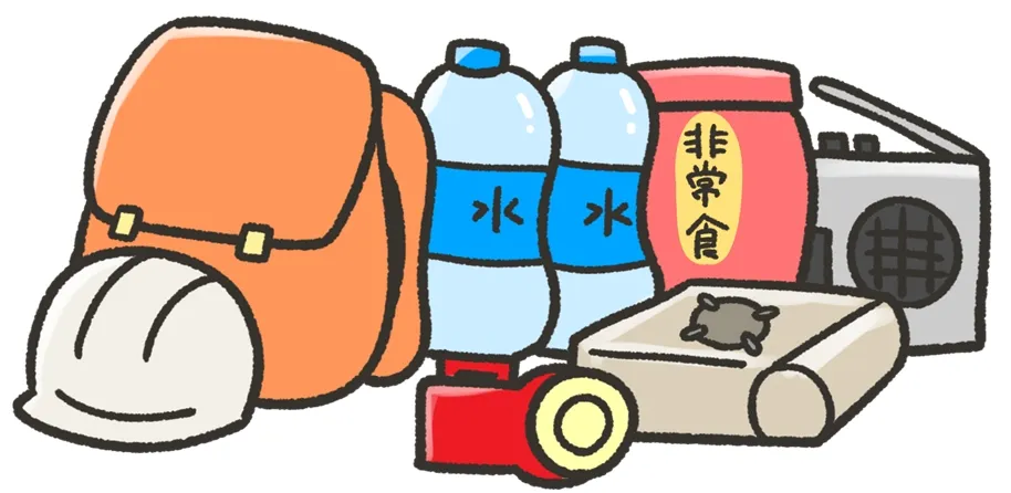 飲料水、携帯食、ホイッスル、懐中電灯、携帯ラジオ、携帯電話、連絡メモ、備えリスト、身分証明書、筆記用具、現金、救急用品セット、持病薬・常備薬、マスク、簡易トイレ、ティッシュペーパー、使い捨てカイロ、ハンカチ・手ぬぐい、安全ピン、ポリ袋、雨具、風呂敷