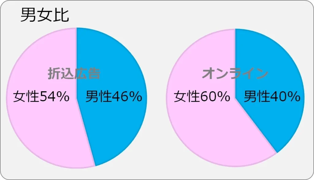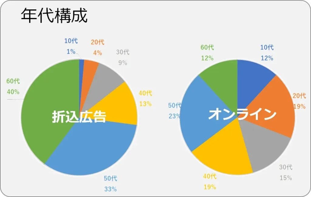 - 折込広告は60代以上と50代が中心、次いで40代。ミドルからシニア層に浸透していることがわかります。