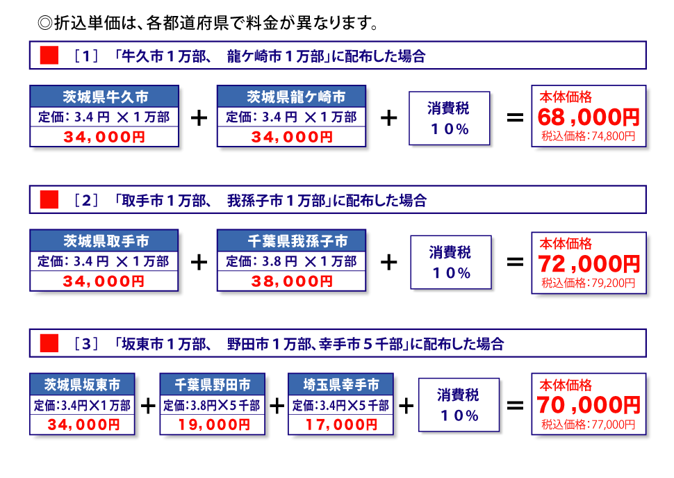 1,000枚×(折込料金@3.30円+配送委管理料@0.10円)+消費税10%=3,740円です。(茨城県内)