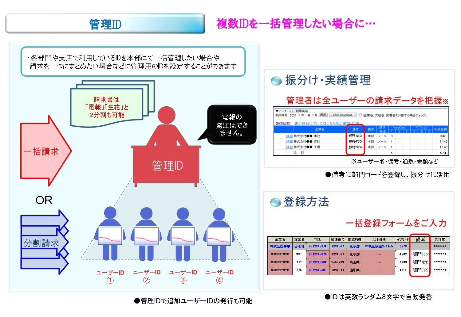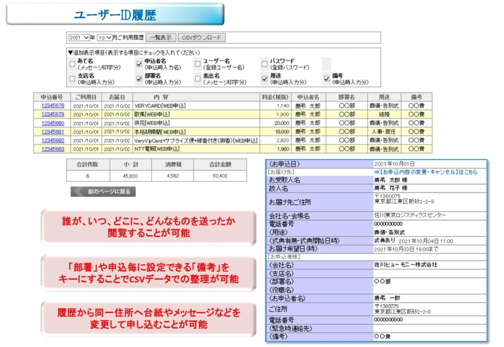 内容・金額・あて名等をリアルタイムでWEB閲覧、CSVデータ化(部門のコード振り分けも可能)※全社利用での管理機能も充実