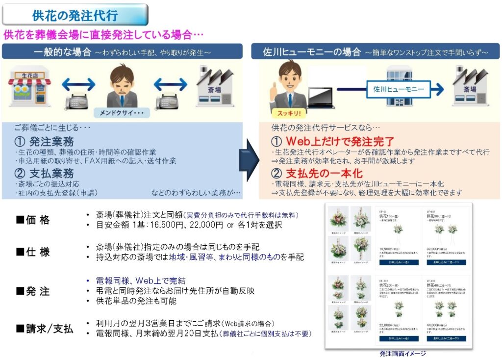 文例やテンプレート機能の活用で約3分程度で申込、生花連続申込も簡単便利。注文・請求も一本化
