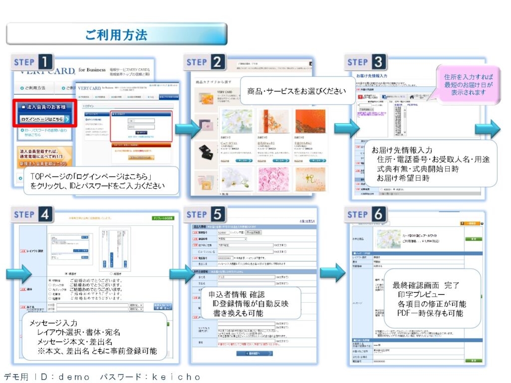 一画面で用途選択からお申込みいただく機能です。用途に合った台紙や文例などを自動で提案する為、入力箇所も少なく、迷う事もないので簡単にお申込みが完結できる機能です。